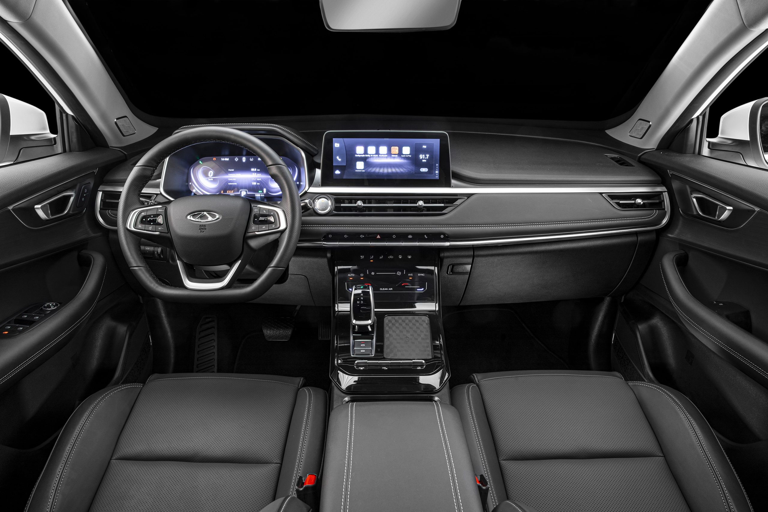 O acabamento do Tiggo 7 Pro é em couro ecológico pespontado e o design dos bancos é esportivo, com bons apoios laterais nos bancos dianteiros. O interior tem diversos nichos para objetos. O console central é alto e na parte inferior há um pequeno porta-trecos. Isso além do compartimento sob o apoio de braços entre os bancos dianteiros e o porta-luvas. A parte superior do console também termina naquele belo acabamento em metal escovado e é lá se localiza o controle de mudança do tipo joystick, assim como o controle do freio de estacionamento eletrônico e o carregador de celular sem fio.