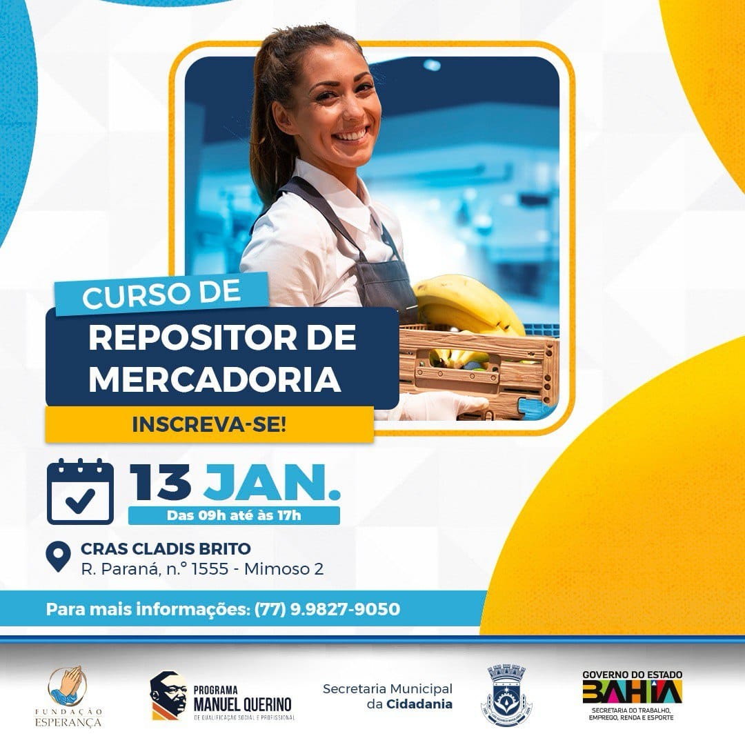 A Prefeitura de Luís Eduardo Magalhães, através da Secretaria Municipal da Cidadania, em parceria com o Programa Manoel Querino, Fundação Esperança e o Governo do Estado, torna público a abertura das inscrições nesta segunda-feira (13), para os cursos gratuitos de almoxarife, operador de caixa e repositor de mercadorias.