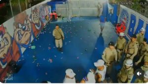 A abordagem aconteceu após denúncias de moradores sobre a aglomeração. Em um vídeo, é possível ver o momento em que equipes policiais conduzem os envolvidos.